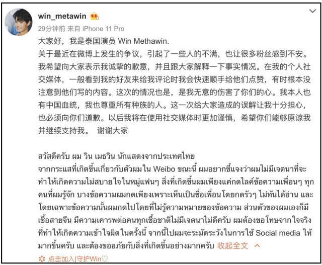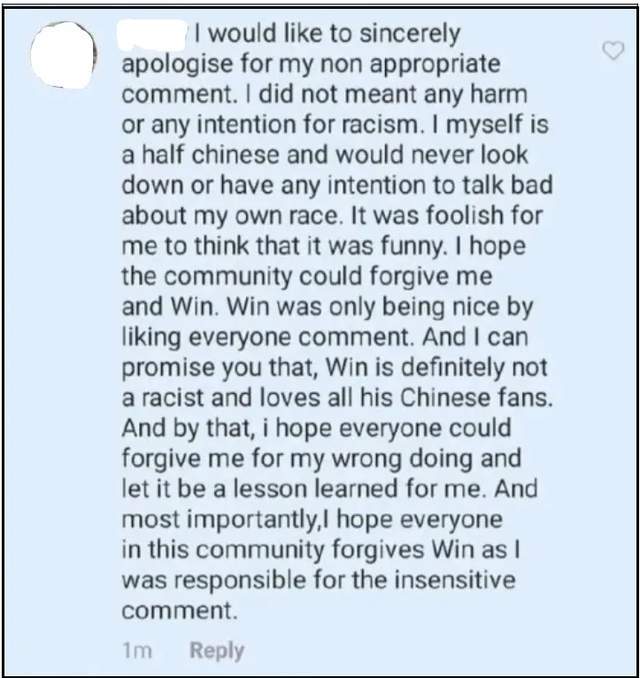 黑历史被曝光之后,Win和他的好友先后道歉,一个说手滑没看好友到底说了啥,一个说我只是开玩笑我也有一半中国血统。