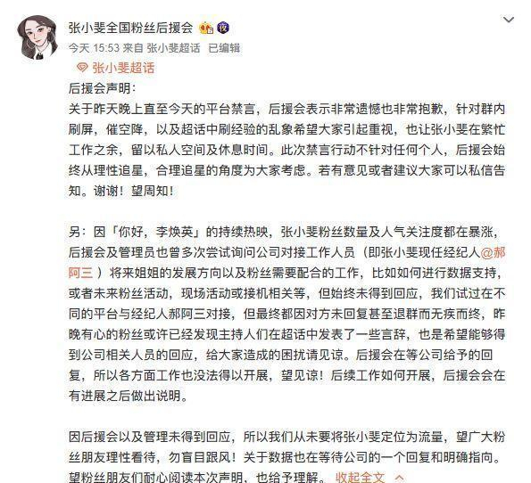 如今随着她的大火,所谓“张小斐后援会”迅速冒出来怼张小斐的公司和经纪人,她们认为经纪人和公司并没有尽责。因为张小斐的经纪人并没有和粉丝对接,甚至还退出后援会的群。