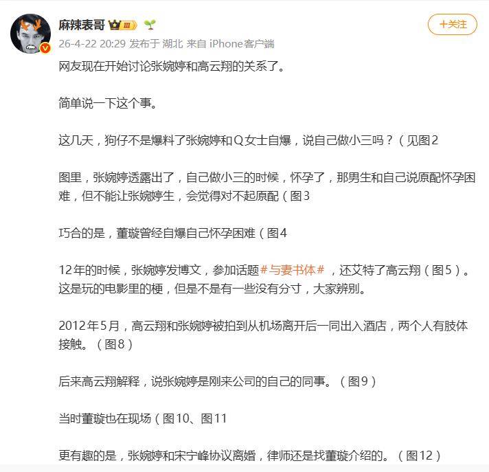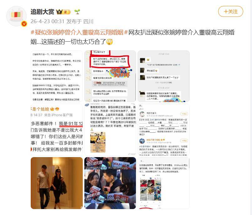 一则陈年旧瓜,最近被网友扒出了令人细思极恐的新线索。据网友4月23日爆料,关于张婉婷疑似早年曾介入董璇与高云翔婚姻的推测,在网络上炸开了锅。一切线索的源头,竟来自她本人自曝的“知三当三”经历,与另一段公众熟知的婚姻细节,产生了惊人的重叠。