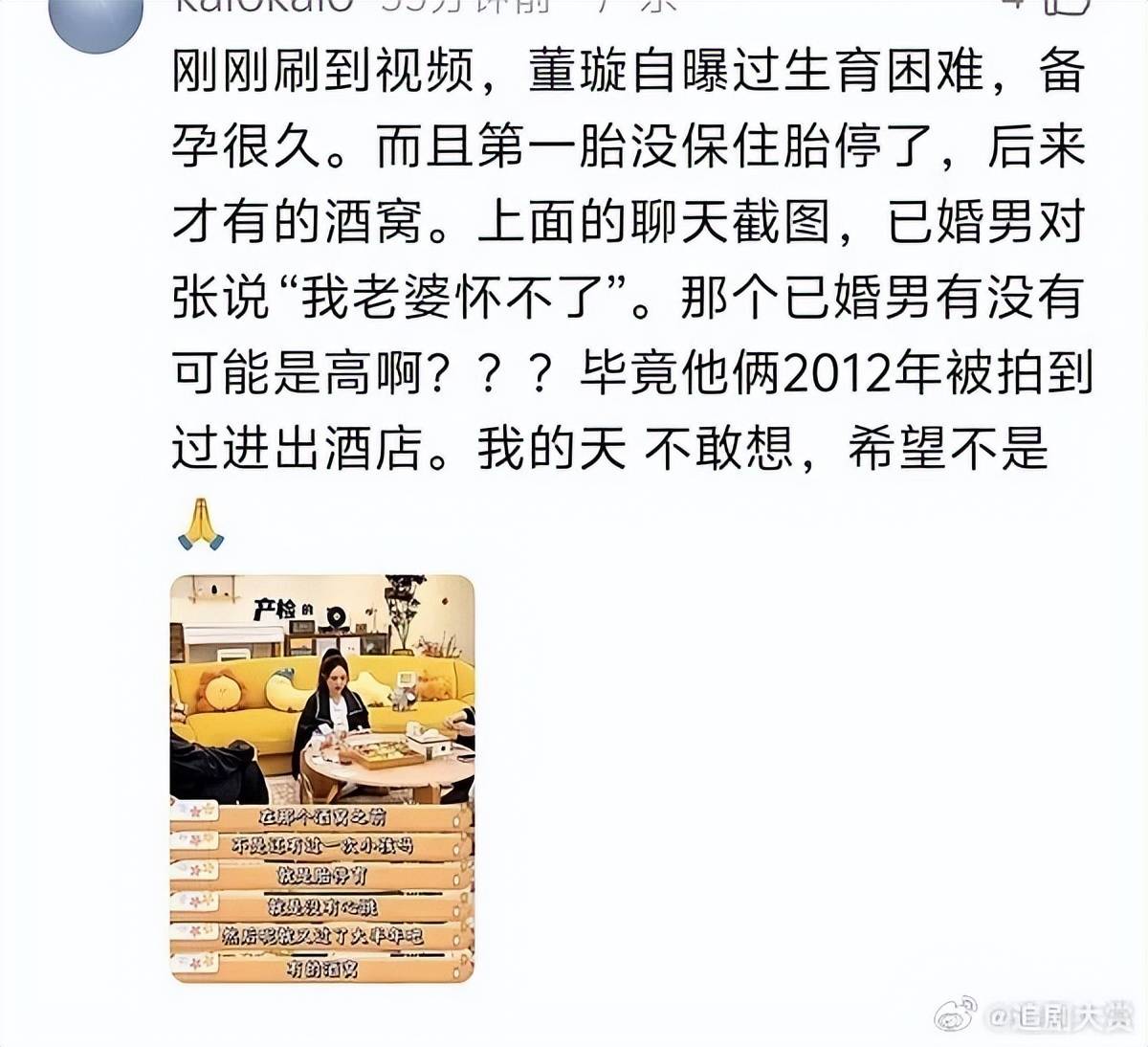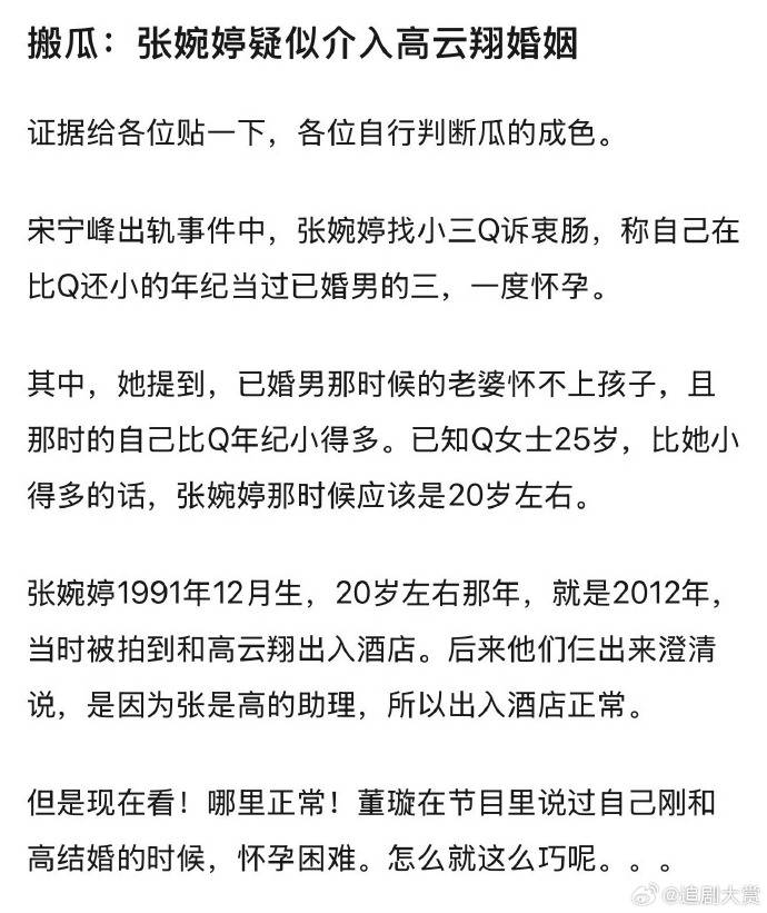 这场“推理风暴”的起点,是张婉婷在处理丈夫宋宁峰出轨事件时的自述。她为劝退第三者Q女士,透露自己20岁左右(约2012年)曾爱上一位已婚男性并怀孕,对方以“妻子怀不上孩子”为由要求她堕胎。正是这个极具私人化的理由,瞬间点燃了网友的记忆——董璇在与高云翔2011年结婚后,曾长期公开透露备孕困难,并在2015年经历胎停育后,才艰难生下女儿。时间与核心情节的“巧合”,让网友直呼“剧本都不敢这么写”。