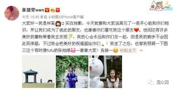 张慧雯发微博,以林奚口吻告别观众:“大家好~我是林奚,实在抱歉,今天就要和大家说再见了~我走了之后,也替我照顾一下图三这个有时傻fufu的张姑娘~谢谢大家!告辞~”