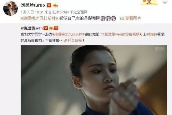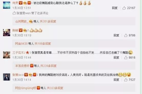何炅、陈赫、张博、黄晓明、佟丽娅等明星也转发张慧雯的这段舞蹈,何炅还说:“被这段舞蹈虐到心酸”。