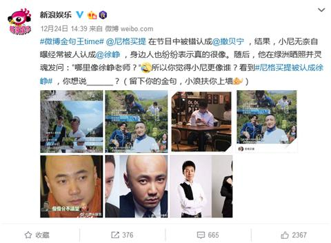 时间回到24日下午,新浪娱乐官方微博发布了一组尼格买提主持的《你好生活》节目截图并写道,“@尼格买提 在节目中被错认成@撒贝宁,结果,小尼无奈自曝经常被人认成@徐峥 ,身边人也纷纷表示真的很像。”