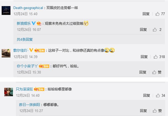 25日凌晨4时39分,徐峥就回应了。徐峥转发了新浪娱乐微博账号此前关于两人“撞脸”的相关内容,幽默回应称,“其实,真正的宝藏男孩都长得差不多”。↓
