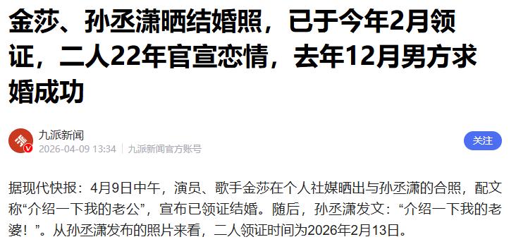 4月9日,知名女星金莎和小17岁男友孙丞潇,结婚领证的消息冲上热搜。