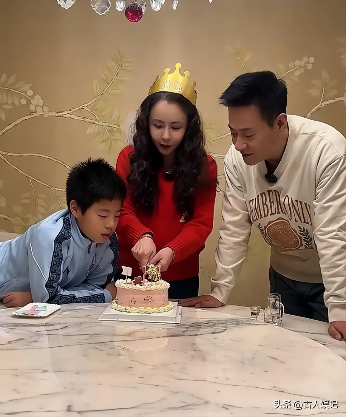 最近,一组杨若兮的全家福在网上疯传,46岁的她穿着家居服,和导演丈夫连奕名、儿子大福挤在自家厨房里,对着一个歪歪扭扭的粉色爱心蛋糕笑得开怀。