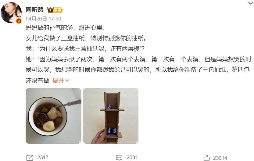 《乘风2026》二公淘汰名单公布后,陶昕然带着遗憾回到家中。她没想到,迎接她的不是女儿何陶的失落,而是一个精心准备的手工礼物——三层“抽纸楼房”,每一层对应妈妈在节目中的表演次数。