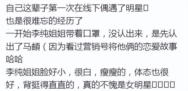 第一次在线下见到这对明星情侣的网友十分激动,直呼是很难忘的经历。该网友还附文大赞李纯本人脸好小,皮肤白净,瘦瘦的,体态也超好。