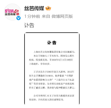 4月16日上午,上海丝芭文化传媒有限公司发布讣告,证实公司创始人王子杰因心源性疾病,于4月14日在上海去世,享年63岁。