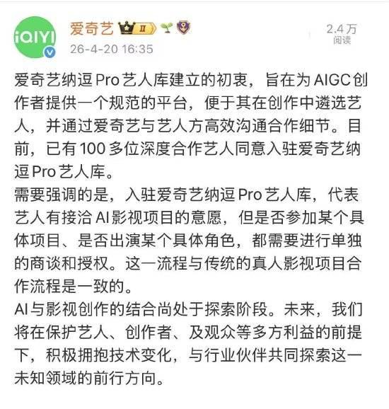 爱奇艺称,需要强调的是,入驻爱奇艺纳逗Pro艺人库,代表艺人有接洽AI影视项目的意愿,但是否参加某个具体项目、是否出演某个具体角色,都需要进行单独的商谈和授权。这一流程与传统的真人影视项目合作流程是一致的。