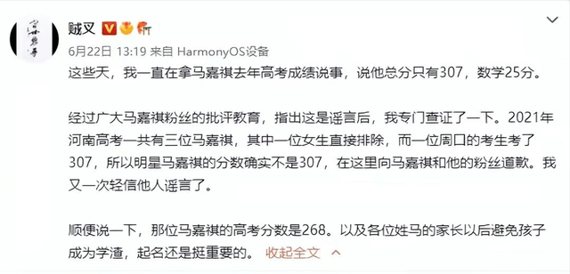 这几天高考成绩出炉,马嘉祺去年的成绩又被当成了谈资。有大V发文说马嘉祺去年高考成绩不是307分,而是268分。