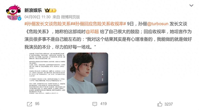 据4月9日报道,演员孙俪的一篇长文,将正在播出的电视剧《危险关系》推上了话题中心。面对该剧0.396%的全国收视率(CVB数据),这位曾经的“收视女王”没有回避,而是坦然写下:“我对这个结果其实是有心理准备的。”