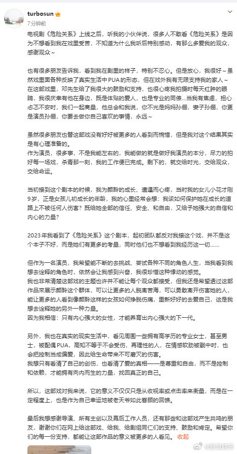 这篇长文,与其说是一次危机公关,不如说是一次关于演员职业边界与个人选择的坦诚告白。在收视率为王的行业压力下,孙俪选择将视角投向作品的社会意义和自身创作的初心。当“演员的本分”与“市场的判决”出现落差时,她交出的答案是把评判权交给时间和观众。这场“危险关系”的收视冒险,最终成了她演员生涯中一次关于“左右”与“不能左右”的公开课。
