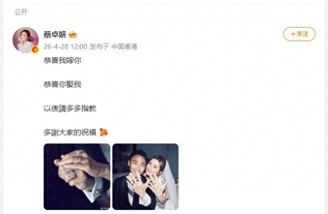 4月28日,蔡卓妍(阿Sa)发文宣布结婚。