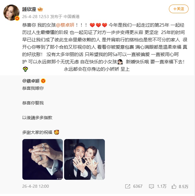 随后钟欣潼(阿娇)发文祝福:恭喜你 我的女孩@蔡卓妍 !!!今年是我们一起走过的第25年,一起经历过人生最懵懂的阶段,也一起见证了对方一步步变得更从容、更坚定。25年的时间早已让我们成了彼此生命里最依赖的人,是并肩前行的搭档也是密不可分的家人。很开心你等到了那个合拍又珍视你的人,看着你被爱意包裹、满心满眼都是温柔幸福,真的好欣慰!没有太多华丽的话,只希望我的阿Sa可以一直被偏爱、一直被用心呵护,可以永远做那个无忧无虑、自在快乐的小女孩。新婚快乐哦,要一直幸福下去!永远都会在你身边的小娇娇 呈上