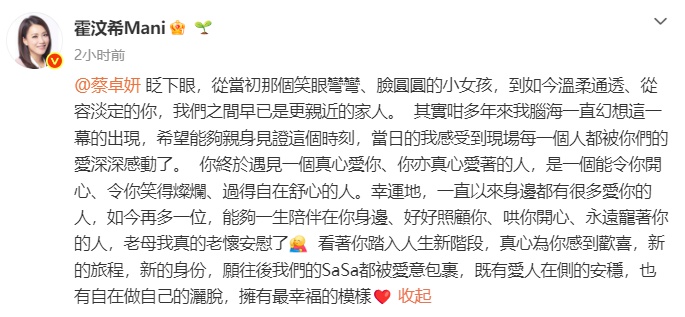 经纪人霍汶希也发文祝福:你终于遇见一个真心爱你、你也真心爱着的人,是一个能令你开心、令你笑得灿烂、过得自在舒心的人,老母我真的老怀安慰了。看着你踏入人生新阶段,真心为你感到欢喜,新的旅程,新的身份,愿往后我们的SaSa都被爱意包裹,既有爱人在侧的安稳,也有自在做自己的洒脱,拥有最幸福的模样。