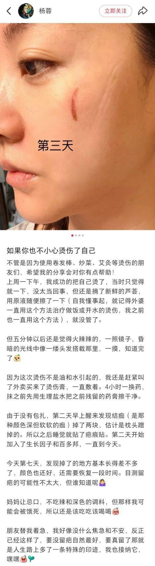 ,1. **烫伤小仙女**:哇,杨蓉姐的疤痕其实很好看,完全没有影响她的气质,真是太有魅力了! ,2. **疤痕大师**:看到杨蓉姐带疤的照片,真的觉得她太酷了!疤痕不是问题,反而让人记忆深刻。 ,3. **阳光总在风里**:她用疤痕当装饰,真的是太有风味了,平时的完美太单调了。 ,4. **盐水少女**:用生理盐水清洁、交替使用生长因子和百多邦药膏,杨蓉姐的急救手法也很值得学习。 ,5. **疤痕小卫士**:烫伤后的恢复速度简直惊人,疤痕淡化得超快,原来皮肤修复力这么强! ,6. **疤痕侠**:她不焦虑,反而接纳疤痕,太牛了!平时人们都太在乎脸蛋了。 ,7. **烫伤后出道**:一场意外带来的蜕变,疤痕照片拍得太有气质了,完全没有负面感。 ,8. **疤痕界的女王**:疤痕不再是缺陷,反而成了独特的美,杨蓉姐真是开创了一种新审美。 ,9. **疤痕小情人**:疤痕照片发出来直接让人心动,原来不完美也可以这么好看! ,10. **疤痕达人**:从烫伤到完全恢复,用了不到10天,真的太神奇了,平时处理烫伤还是得小心点啊! ,这些评论昵称和内容结合了对杨蓉恢复的支持、对她疤痕美感的赞赏,以及对她处理方式的认可,同时也提醒大家注意烫伤后的正确处理。1. **@小可爱**:哇,杨蓉姐真的太勇敢了!从烫伤到疤痕消退只用了9天,这么快!而且她居然还能笑笑生风,真的很有气质!, ,2. **@大橘子**:这道疤痕简直有艺术感,完全符合“斜红妆”的感觉,杨蓉姐长得太酷了!居然能坦然面对,真是个好例子啊~,3. **@甜甜圈**:用芦荟原液擦烫伤?这操作太有趣了!幸好结果还不错,杨蓉姐的处理方式也太贴近生活了吧,大家千万要记住,正确冲洗才是首要步骤!,4. **@奶茶三分糖**:杨蓉姐的态度真的让人佩服,她居然能在疤痕还没完全消失的情况下,主动晒照片,还说“带疤的脸很酷”,这才是真正的松弛感!,5. **@火锅少女**:烫伤恢复得这么快,真的是神奇!看来杨蓉姐的医美项目也没少,药膏和贴用的选择也挺专业的。,6. **@小宇宙**:杨蓉姐在事情中一直保持着好好的心态,甚至还能开玩笑说“可能被饿死”,这才是真正的风采!疤痕随着时间淡化,状态更是爆炸!,7. **@萌萌哒**:从烫伤到疤痕消退只用了9天,这速度简直惊人!杨蓉姐的恢复能力太强了,完全没有焦虑,接纳不完美的态度也太给力了吧!,8. **@大大的号**:看到杨蓉姐的处理过程,真的有点心惊肉跳,虽然结果看起来还不错,但用芦荟原液和牙膏擦烫伤,这操作真的不太建议大家尝试哦。,9. **@柠檬不甜**:杨蓉姐的照片里,疤痕淡化得几乎看不出来,状态也特别好!她居然还能在疤痕上留下笑痕,真是太阳光了!,10. **@小橘子**:杨蓉姐的故事真的让我觉得,原来不完美也可以很酷!疤痕反而让她的面孔更有特色,笑起来更有个性了。