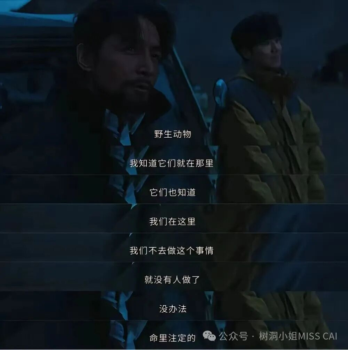 还有与盗猎者对峙的台词:“对一两个王八蛋我死都不怕”“我一定要活过45岁”,沙哑嗓音与颤抖肢体,将角色的无畏与对生命的渴望完美融合。
